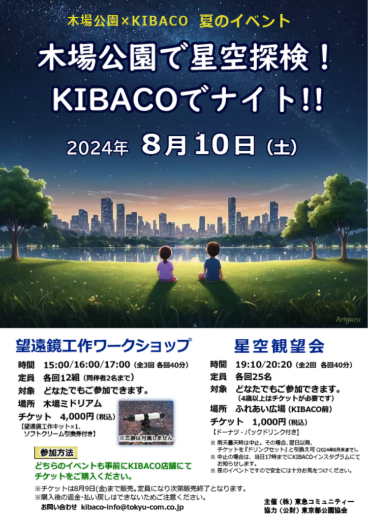 【2024年8月10日(土)】木場公園×KIBACO”夏のイベント”のお知らせ 2024.07.22 木場公園で星空探検!KIBACOでナイト!! 12月・4月に大好評だった星空観望会を再び開催いたします。 また、望遠鏡工作ワークショップも開催!! 夏の思い出に、望遠鏡工作ワークショップと星空観望会に参加しよう!!! ①望遠鏡工作ワークショップ 日程2024年8月10日(土) 時間15:00/16:00/17:00(各回40分) 定員各回12組(同伴者2名まで) 対象どなたでもご参加できます。 場所木場ミドリアム 費用4,000円(税込)・望遠鏡工作キット×1、ソフトクリーム引換券付き 参加事前にKIBACO店舗にてチケットをご購入ください。 ②星空観望会【19時10分の回はご好評につき売り切れました】 日程2024年8月10日(土) 時間19:10/20:20(各回40分) 定員各回25名 対象どなたでもご参加できます。(4歳以上はチケットが必要です) 場所ふれあい広場(KIBACO前) 費用1,000円(税込)・ドーナツ、パックドリンク付き 参加事前にKIBACO店舗にてチケットをご購入ください。 ※雨天曇天時は中止。その場合、翌日以降、チケットを「ドリンクセット」と引換え可(2024年8月末まで) ※中止の場合は、当日17時までにKIBACOインスタグラムにてお知らせいたします。 ※夜のイベントですので安全には十分お気をつけください。 チケットの販売日等、詳しくはチラシまたはKIBACOへお問い合わせをお願いいたします。 お問い合わせ:kibaco-info@tokyu-com.co.jp 上記アドレスをクリックするとメールアプリが起動し、メール作成画面が表示されます。 【2024年8月4日(日)・2024年8月12日(月)】ピアノで遊ぼう!リトミック体験&アンサンブル体験 次の記事